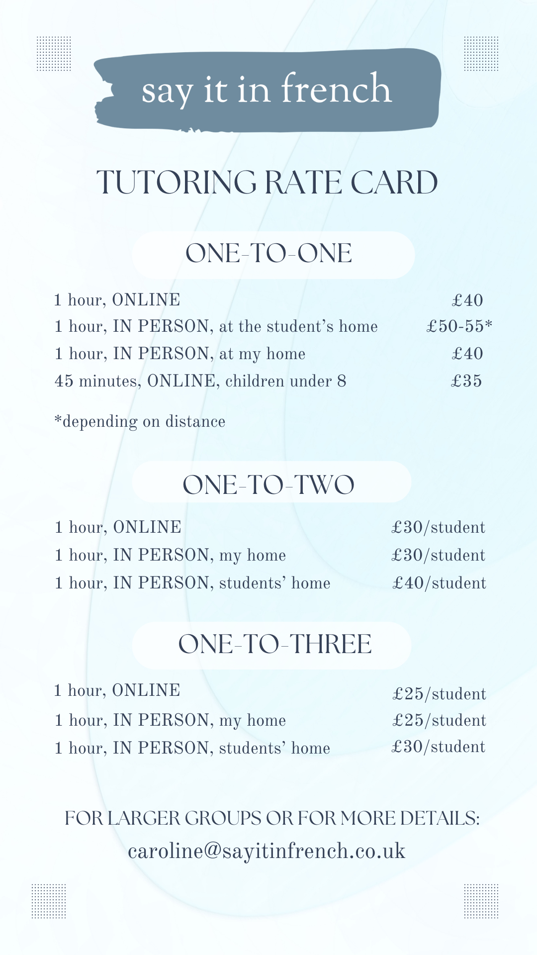 For French lessons in person, one-to-one or in a group, I can welcome you in my home or we can meet in a public place or a rented space. Get in touch for more info.